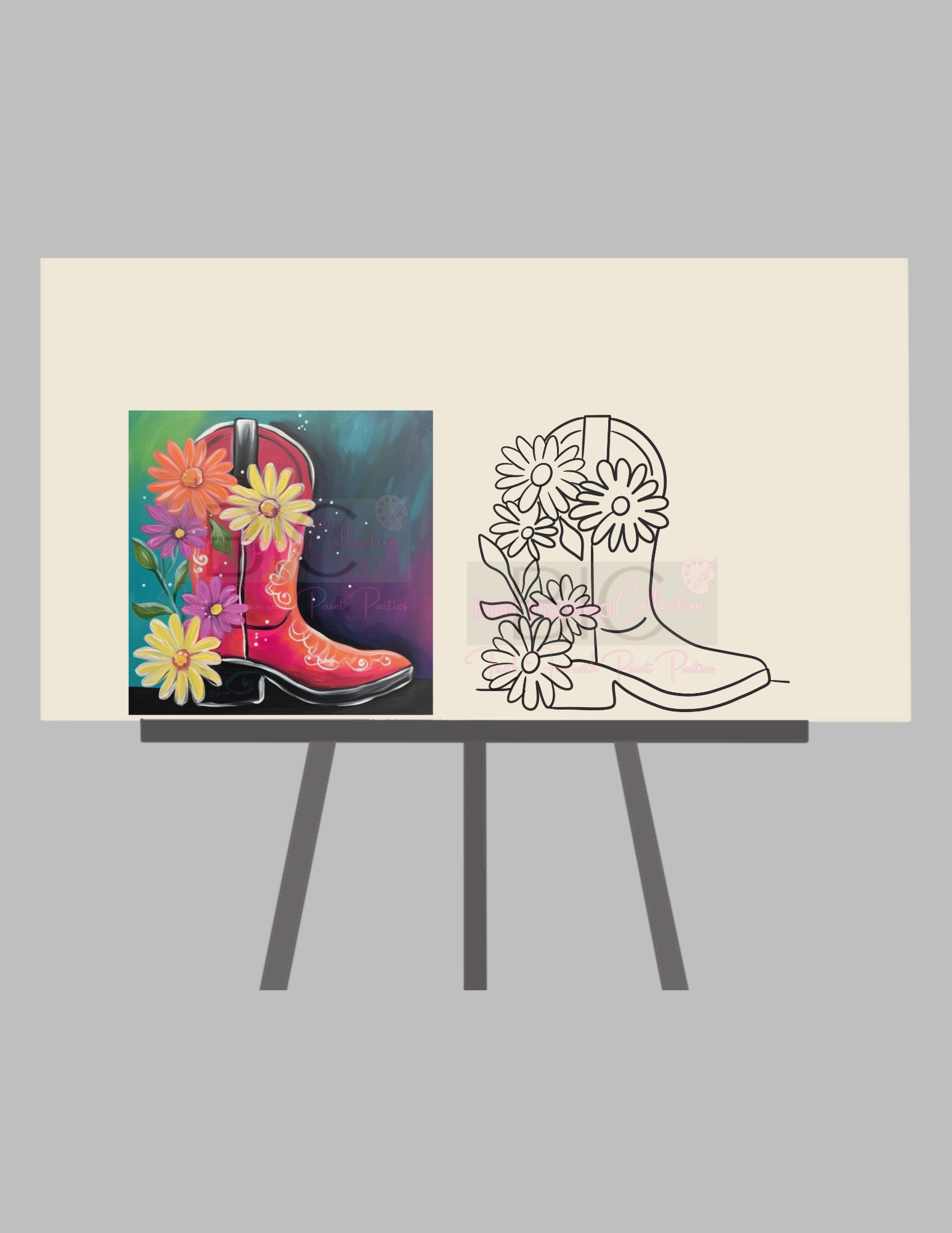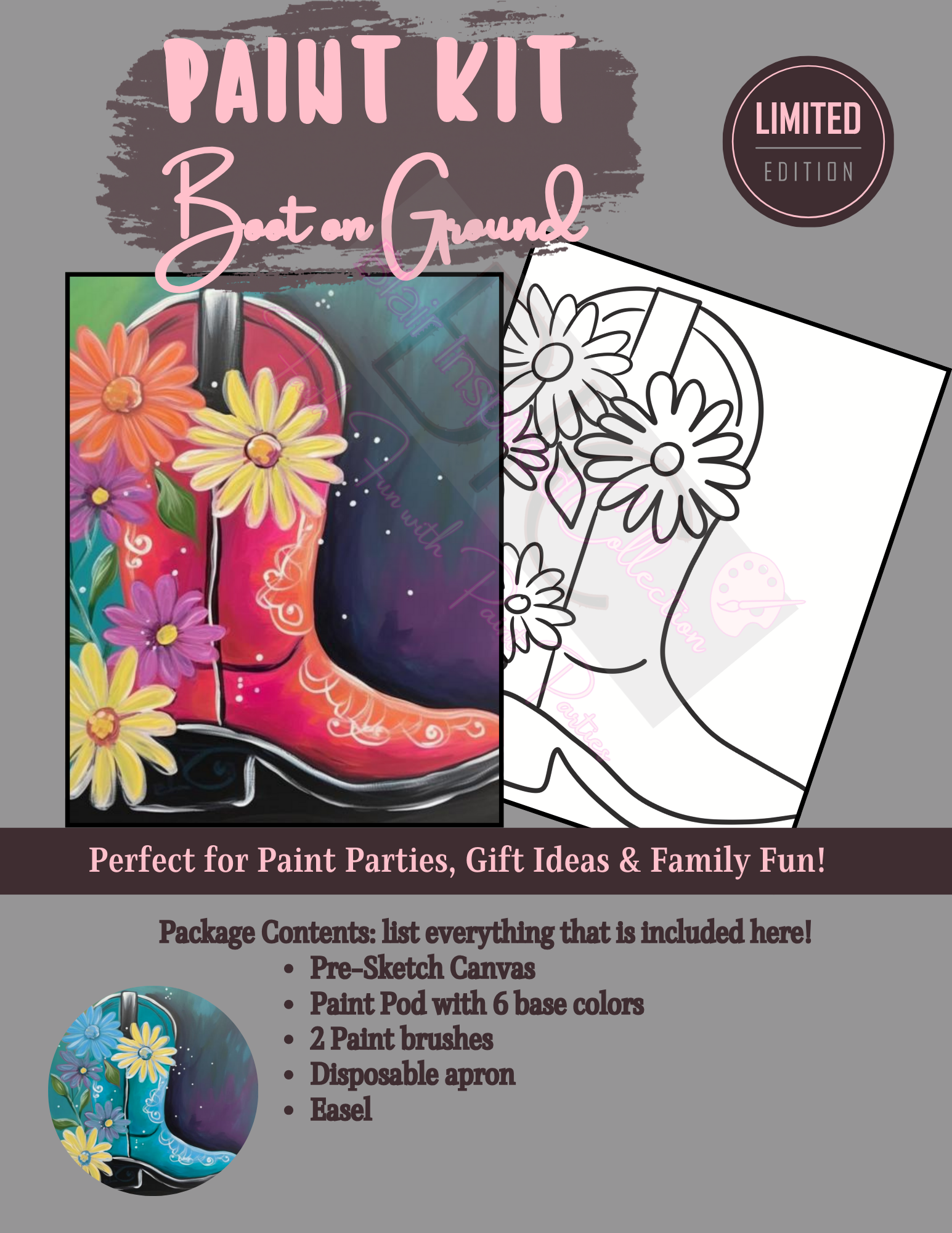 Get ready to paint with purpose, fun and joy! Our Boot on Ground all-in-one paint kit includes a pre-sketched canvas, vibrant acrylic paints, brushes, apron and easel, You also get a sample, instructions and paint mixing guide—everything you need for a fun, relaxing creative experience.