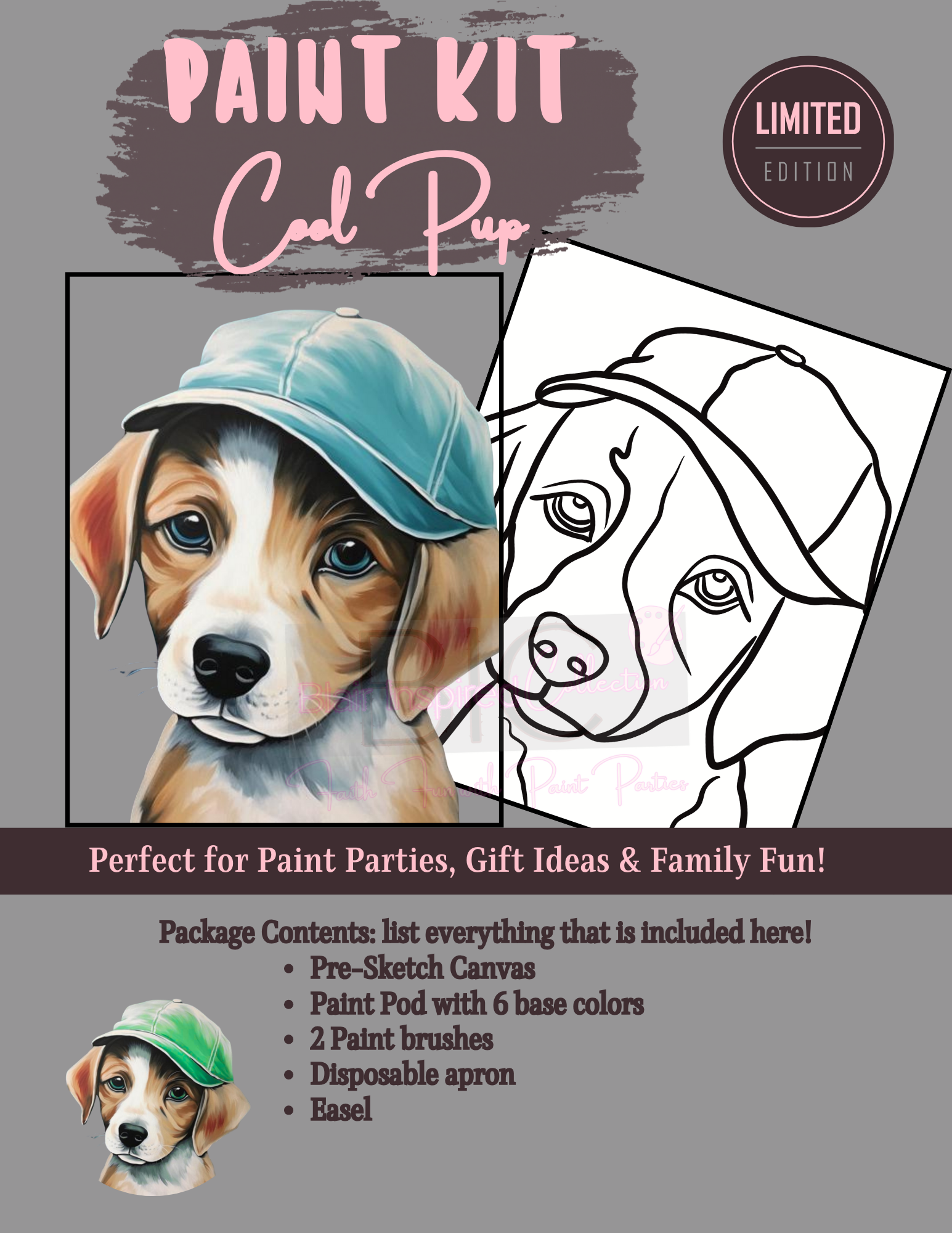 Get ready to paint with purpose, fun and joy! Our Cool Pup night in all-in-one paint kit includes a pre-sketched canvas, vibrant acrylic paints, brushes, apron and easel, You also get a sample, instructions and paint mixing guide—everything you need for a fun, relaxing creative experience.
