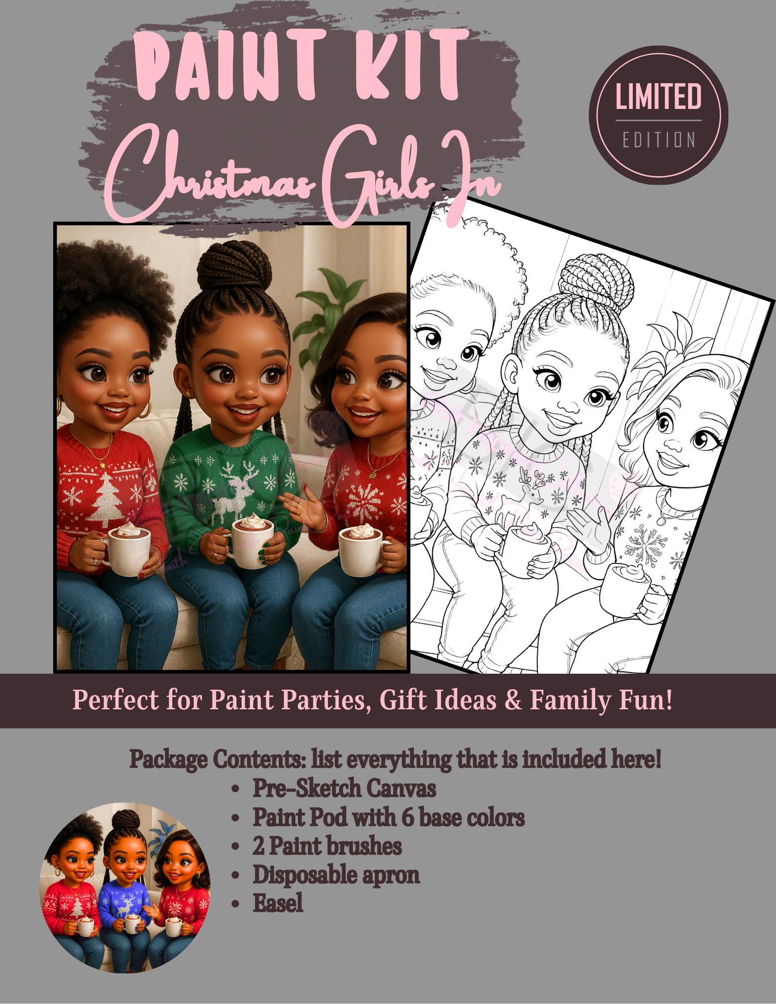 Get ready to paint with purpose, fun and joy! Our Girlies Night In all-in-one paint kit includes a pre-sketched canvas, vibrant acrylic paints, brushes, apron and easel, You also get a sample, instructions and paint mixing guide—everything you need for a fun, relaxing creative experience.