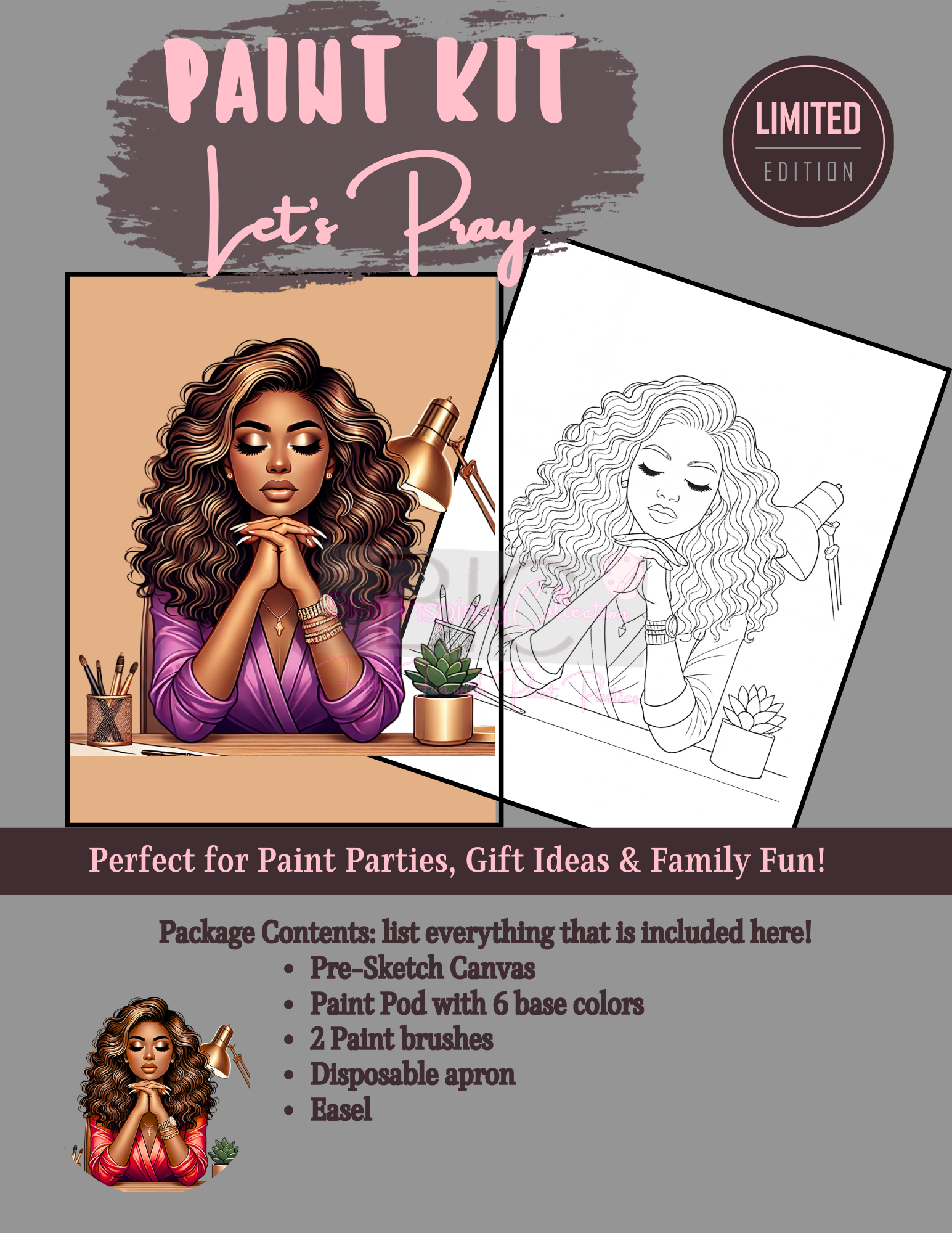 Get ready to paint with purpose, fun and joy! Our Let's Pray Wrap all-in-one paint kit includes a pre-sketched canvas, vibrant acrylic paints, brushes, apron and easel, You also get a sample, instructions and paint mixing guide—everything you need for a fun, relaxing creative experience.