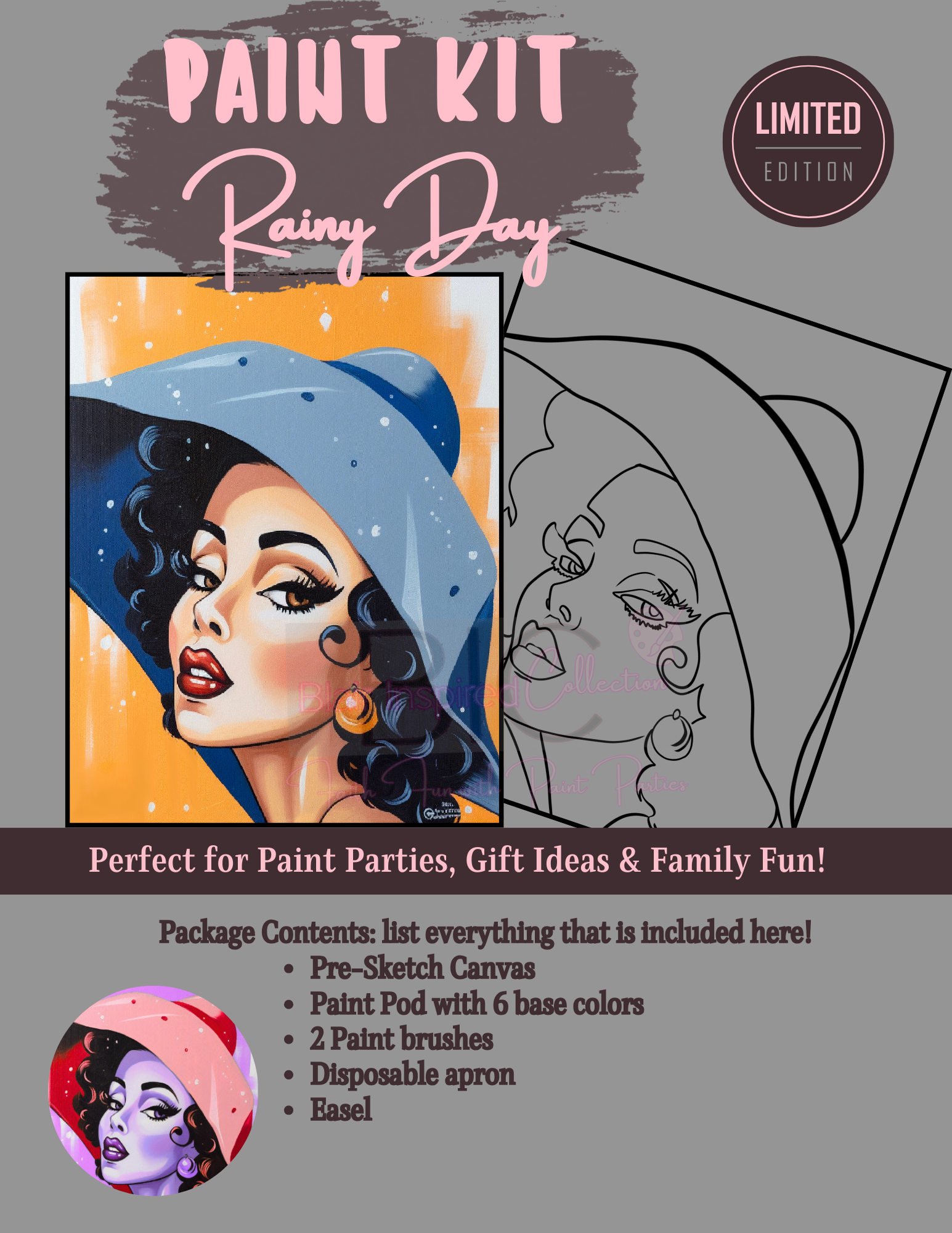 Get ready to paint with purpose, fun and joy! Our Rainy Day all-in-one paint kit includes a pre-sketched canvas, vibrant acrylic paints, brushes, apron and easel, You also get a sample, instructions and paint mixing guide—everything you need for a fun, relaxing creative experience.