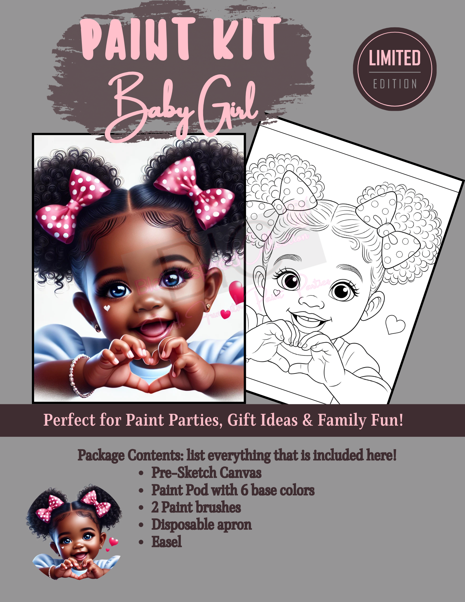 Get ready to paint with purpose, fun and joy! Our Baby Girl all-in-one paint kit includes a pre-sketched canvas, vibrant acrylic paints, brushes, apron and easel, You also get a sample, instructions and paint mixing guide—everything you need for a fun, relaxing creative experience.